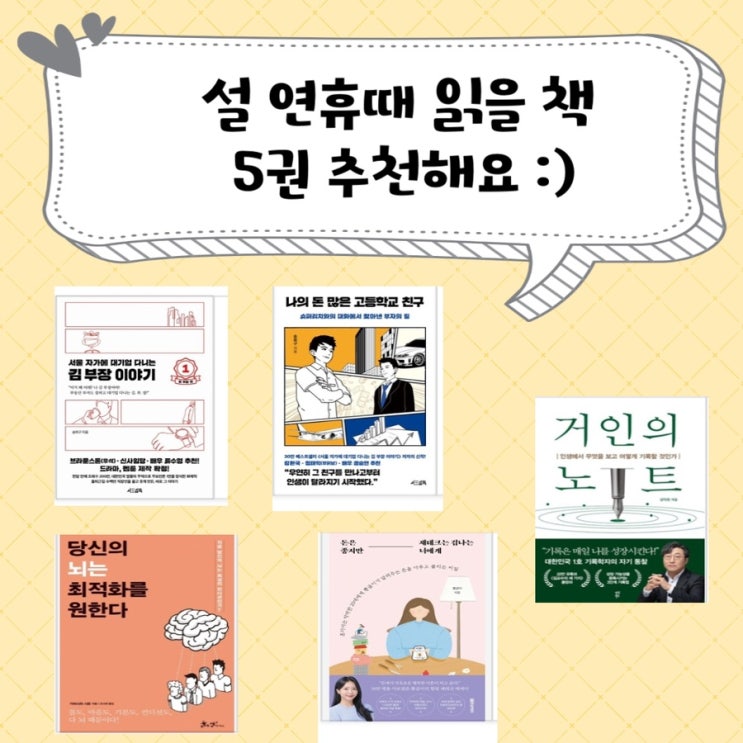 명절 설 연휴 동안 읽을 책 5권 추천 ㅣ읽기 쉽고 이해가 잘 되는 책 추천 ㅣ 자기 계발 재테크 베스트셀러