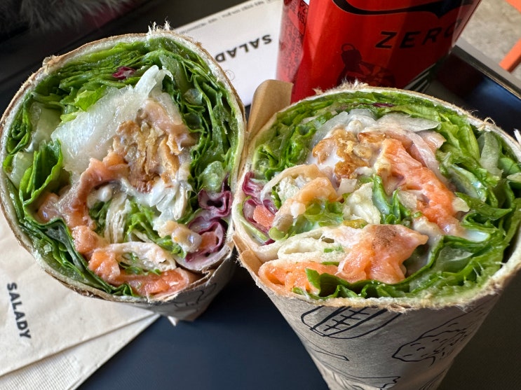 점심밥 샐러디 크리미 연어랩과 제로콜라 먹었다. 외식인들에게 손쉽게 비타민과 섬유질을 공급해주는 두곳...