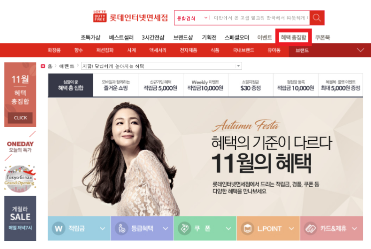 11월 롯데 면세점 적립금 정리 입니다.메인페이지 왼쪽상단 11월 혜택 총집합 메뉴를 누르면 11월의 적립금...