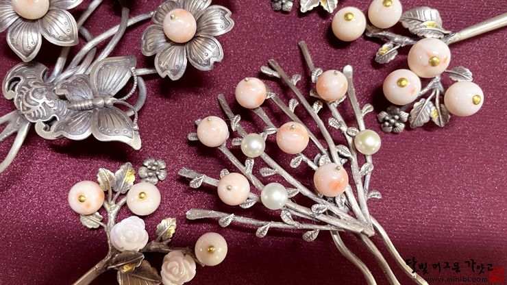 꽃잎 입술을 터뜨릴 때가 되었다, 천연 공산호 뒤꽂이 부케처럼 벌어진 가지모양 은세공에 발그레한 공산호...