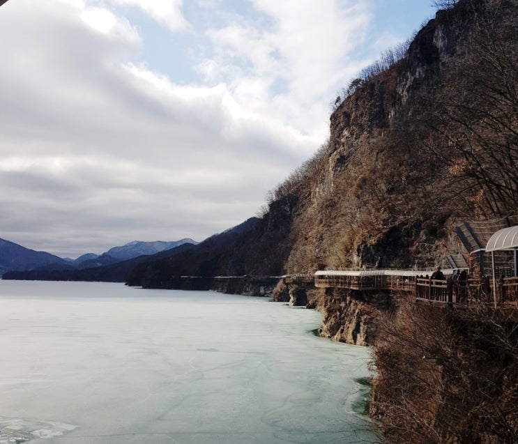 단양강 잔도길 1km정도 되고 높낮이가 별로 없어 걷기 편하다 도담삼봉 여기도 강물이 얼어있음 단양 구경...