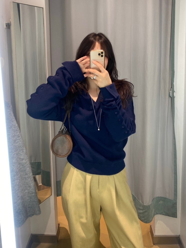 Top 플리즈프로젝트/버튼슬리브 브이넥니트 Bottom 위드아웃썸머/바질슬랙스 소매 단추가 포인트거든요.....
