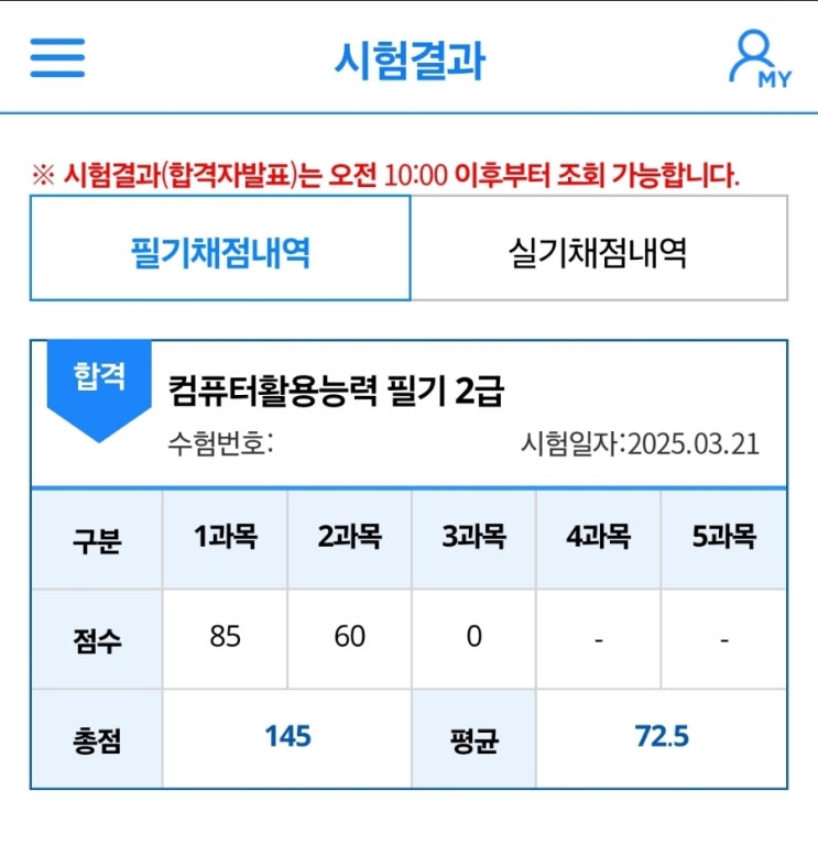 컴활2급 필기시험을 한큐에 합격했다! 목표점수를 계획한데로 거의 만족할 만큼, 딱 점수가 나왔네! 두과목...
