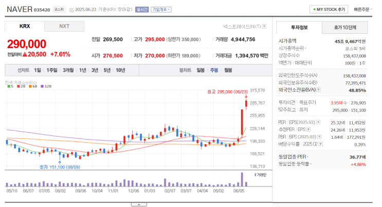 네이버의 주가가 빠르게 상승을 한 상태다. 내 생각보다 빠르게 주가가 움직이고 있다. 가장 큰 이유는 여...