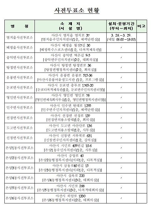 아산시장-2025년 상반기 재•보궐선거 사전투표소 정보