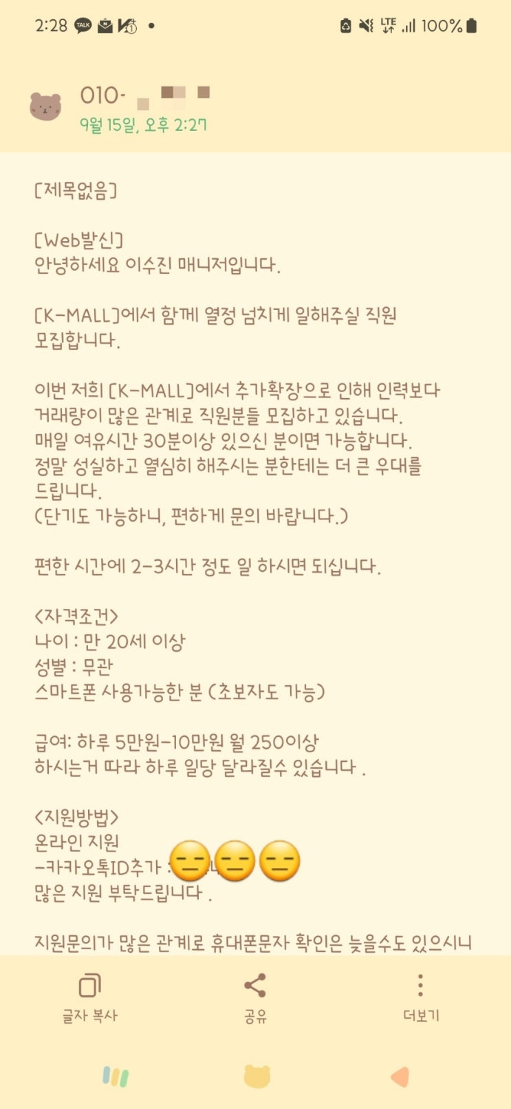 일하던 중 알바 모집 문자를 받았다 K-MALL 추가 확장으로 직원을 모집하는데 매일 2-3시간 핸드폰만 ...