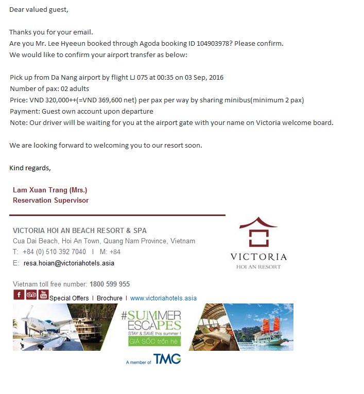 베트남 호이안 빅토리아 리조트 공항 픽업신청/베트남 다낭 공항 픽업 신청/베트남 호텔 픽업 가격