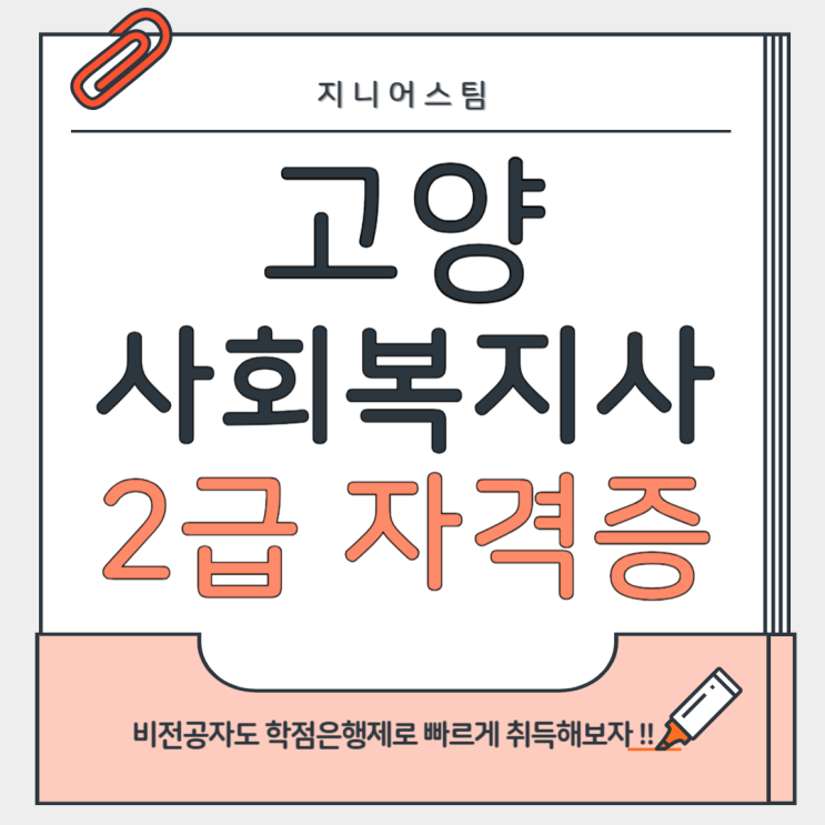 고양 사회복지사2급 자격증 안녕하세요 지니어스 팀 입니다! 오늘은 고양 사회복지사2급 온라인으로 단기간...