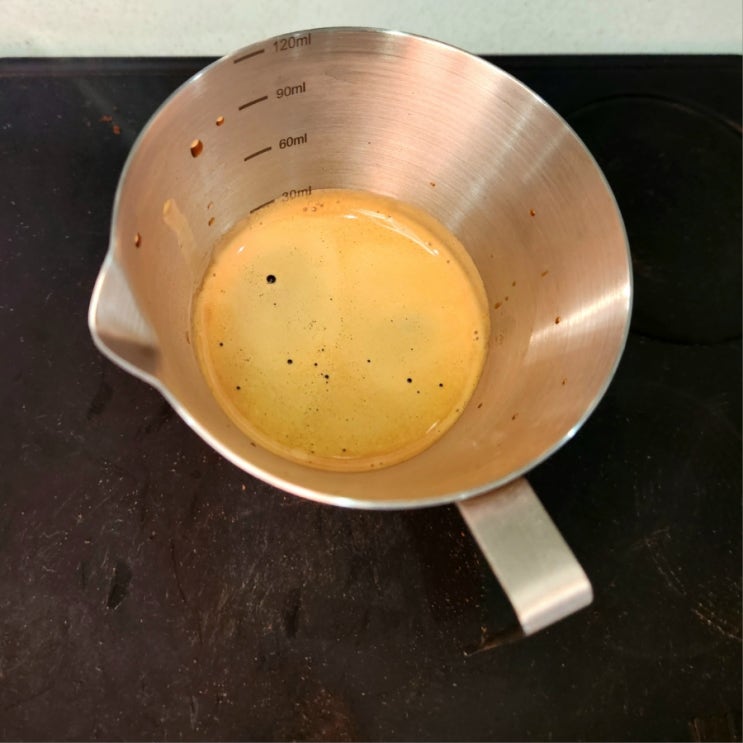 요즘 열씸히 하고 있는 싱글샷 추출 입니다. 10g 으로 살짝 업도징에 26초에 20.6g 추출, 1:2 비율 추출 입...