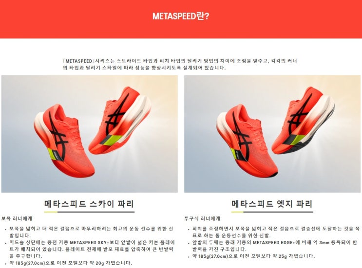 아식스도 파리올림픽을 위한 신제품 대열에 합류했습니다. 대놓고 파리올림픽을 겨냥한듯한 모델명인 메타...