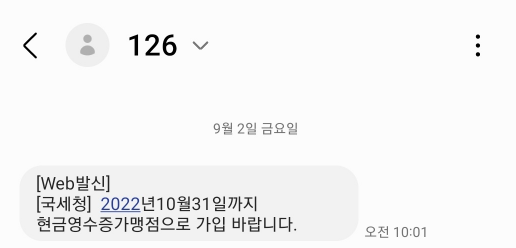 국세청 사업자등록이 되고 사업자등록증이 발급이 되면 의무적으로 현금영수증 가맹점으로 가입하라는 문자...