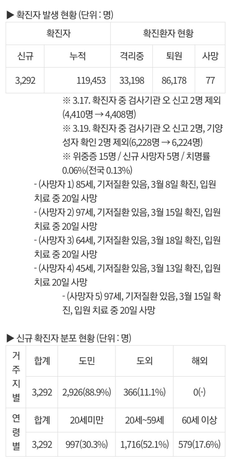 [도청브리핑자료에서 ...추가변경내용이 나오면 첨가하겠습니다.] * 22일, 오후5시기준 확진자수 : 3,896명...