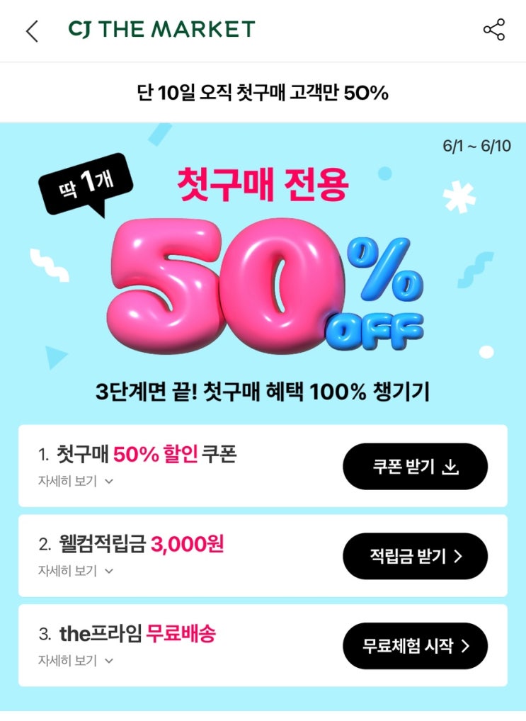 CJ더마켓 첫구매 6/1~6/10 한정 혜택/CJ더마켓 초대코드 QGSP1961 (ft. 첫구매 적립금 3천원/초대코드 적립금 5천원)