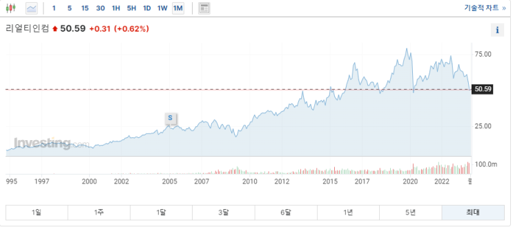 부동산 주식 리츠 중에 가장 유명한 리얼티인컴이 고점대비 30% 이상 하락하여 현재 50달러 선에서 거래되...
