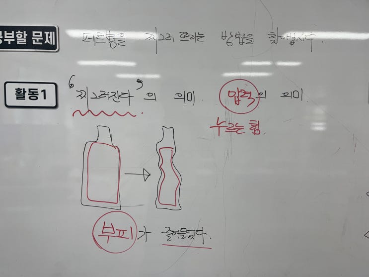 눌렀을 때 찌그러지는 페트병, 주사기 등의 실험을 통해 압력에 따른 기체의 부피 변화를 관찰하고 정리하...