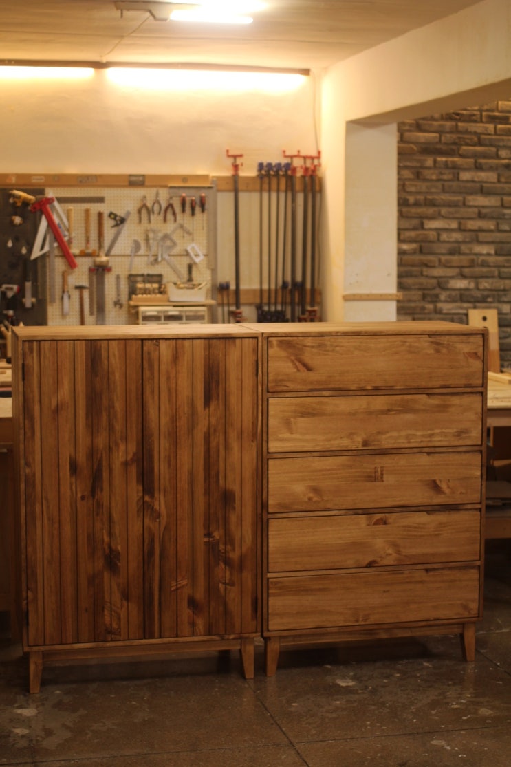 사이즈: 가로 600 * 폭 170 * 높이 650 수종: 소나무 (뉴송) 마감: 오일스테인 (차콜 브라운 색상) 목공 배...