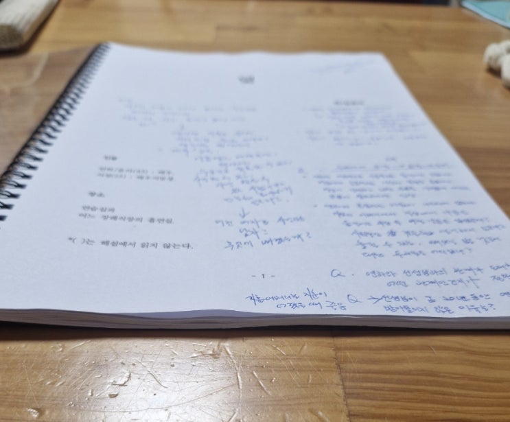 지훈배우와 화요일에 만나기 전에 대본을 연구해야했다. 첫리딩은 관객으로써 읽는 것과 같은 느낌이다. 그...