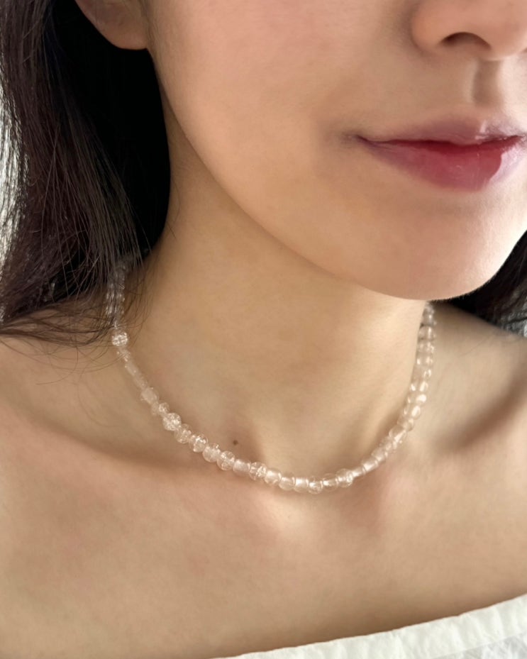 안녕하세요 쥬니입니다:) 은은한 연핑크/연살구 빛의 own muse 투명 구슬 비즈 목걸이 소개할게요-! 영롱하...