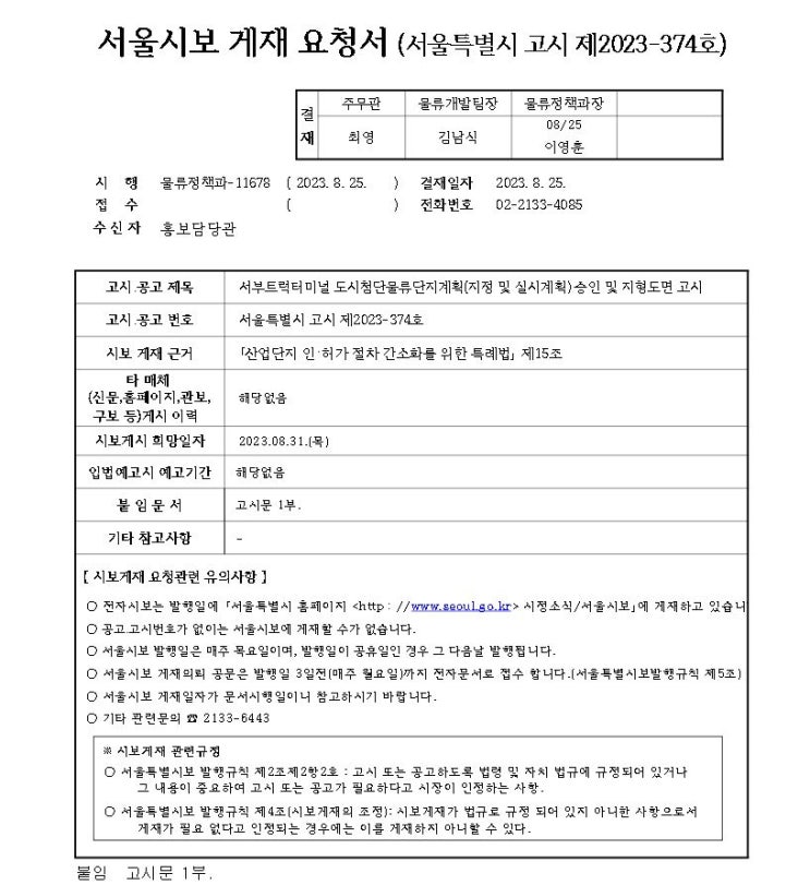서부T&D-신정동 물류단지 진짜 승인 및 고시(2023년 8월 31일)