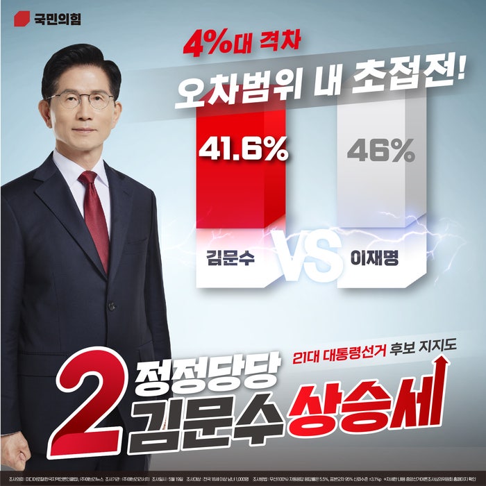 여론조사, 김문수 후보 4.4% 오차범위 내 초접전 김문수 후보가 이재명 후보를 오차범위 내 바짝 추격했습...