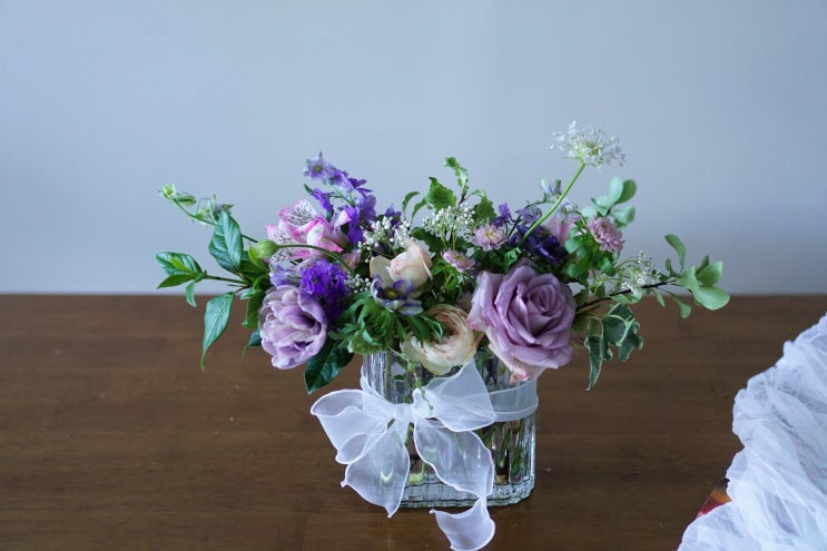Vase Arrangement 오늘의 꽃 화병입구가 가로로 넓은 타원형이다. 조카와 함께 보라, 블루로 꾸며 ...