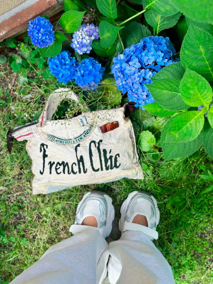 메리제인 운동화 샌들로 완성한 리조트룩 | 빈티지 캔버스백, 내추럴 트랙팬츠 코디