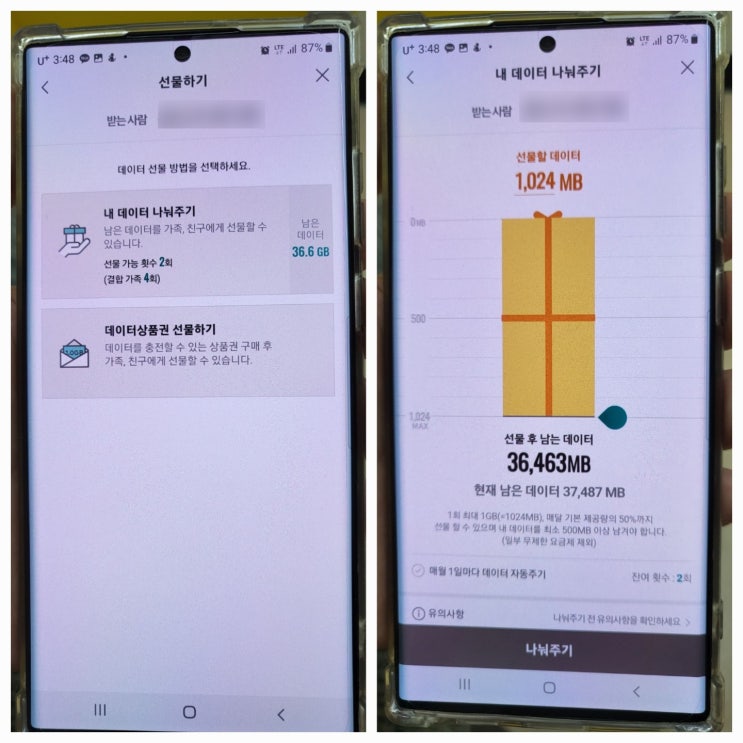 유플러스 데이터 주기 선물하기 쉬워요