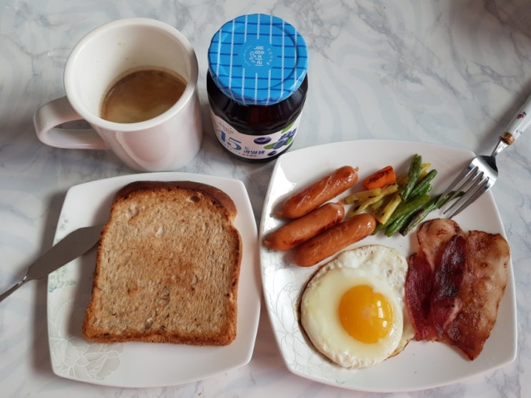 3월 3일 일요일 아침식사 냉동실있는거 죄다 꺼내서 차려봄 밥순이가 빵먹음 복음자리 45도 블루베리잼 블...