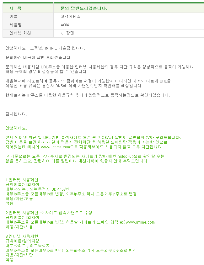 IPTIME 공유기 인터넷 전체차단 후 특정사이트(URL)만 접속허용 설정 관련