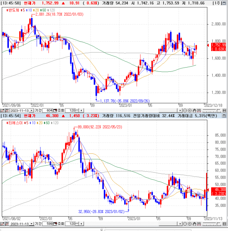 23년11월16일/티에스이와 반도체업종 지수