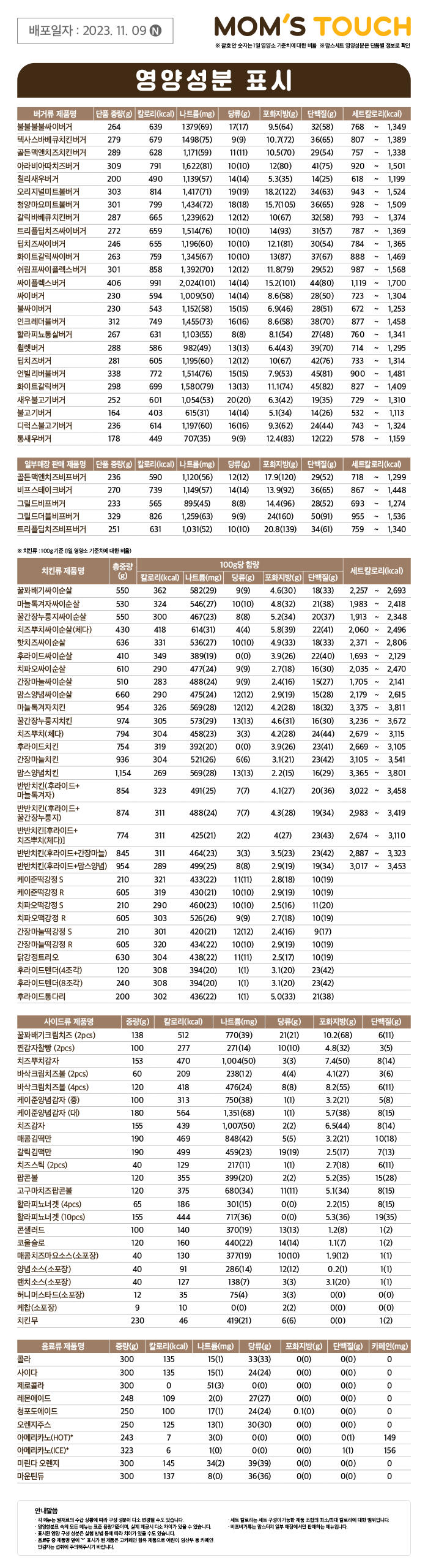 맘스터치 칼로리