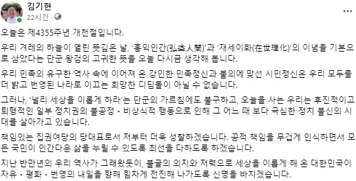 김기현 국민의힘 당 대표 | "우리 겨레의 하늘이 열린 뜻깊은 날 '홍익인간'과 '재세...