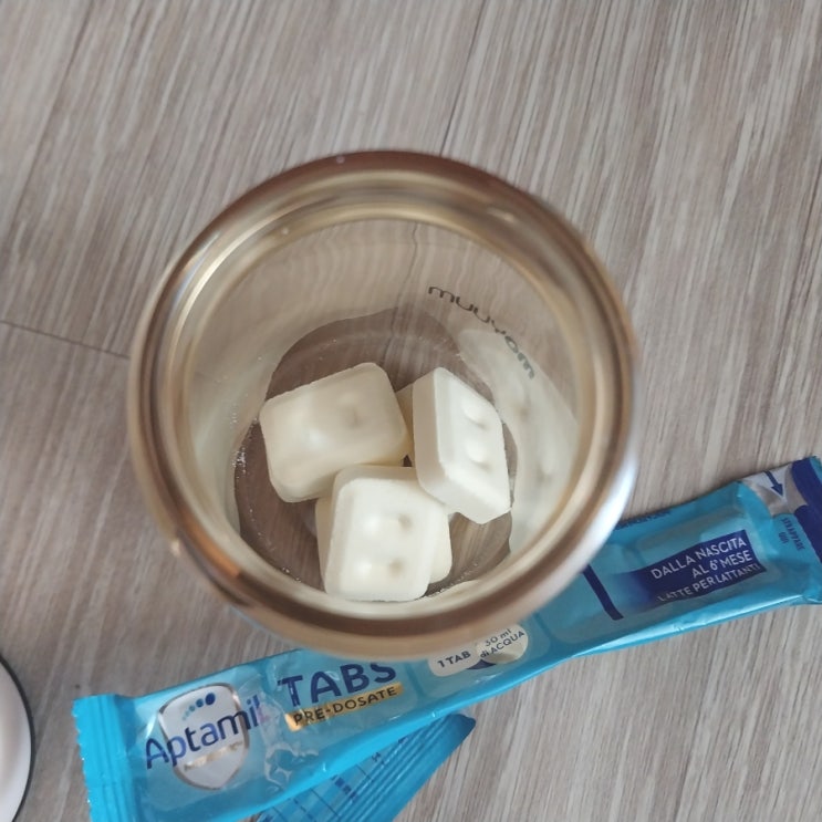 휴대용 분유 압타밀 탭스이다. 하나의 포장에 5개가 들어있다. 1개당 물은 30 mL 넣으면 된다. 탭스를 먼...