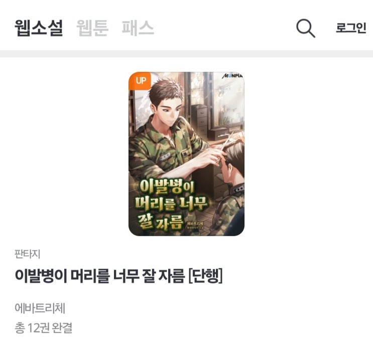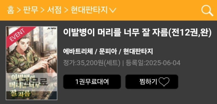 현대판타지 장편소설 '이발병이 머리를 너무 잘 자름'이 원스토리에서 기간한정대여 이벤트에 들...