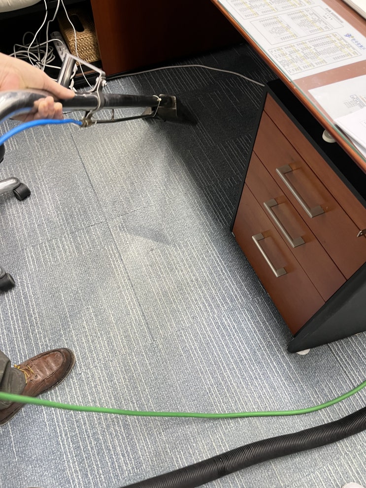 안녕하세요! 하나크린입니다! 오늘은 사무실 사장실 카페트 청소를 위해 왔습니다 탁자 밑에 카페트가 더러...