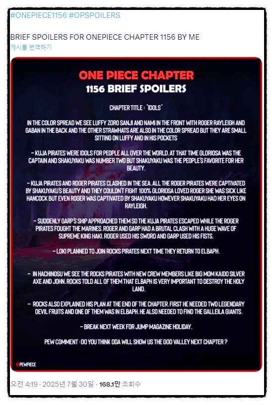 원피스 만화 1156화 일부 스포일러가 오늘 공개 원피스 1156화 제목은 우상들 당시의 과거 구사 해적단은 ...