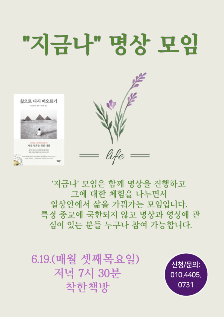 지금나 명상.영성 모임 착한책방 명상.영성 모임 <지금나> 모임 안내드립니다. 6.19. 저녁 7시 30분...