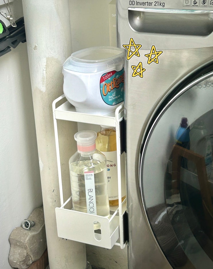 세탁실 수납공간이 부족해서 이런 틈새선반이 필요했는데 자석으로 세탁기에 딱 붙여 쓰는 선반이 생겼어요...