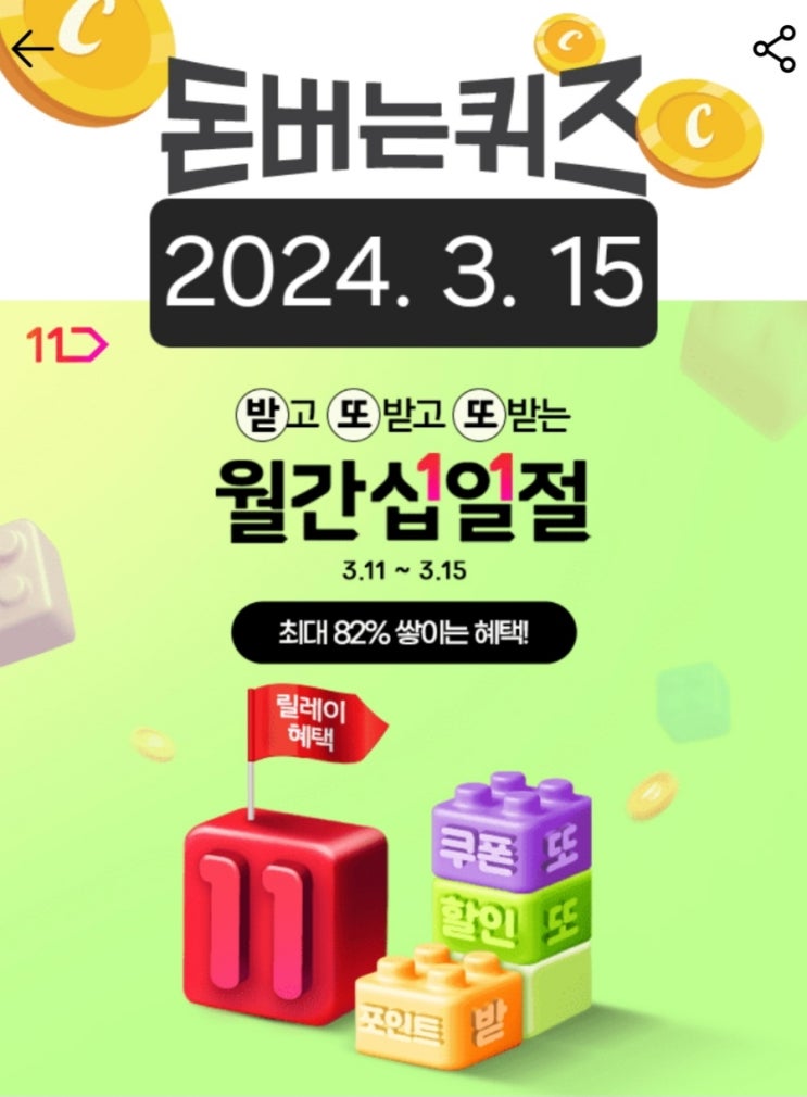 받고 또 받고 또 받는 11번가 월간 십일절 캐시퀴즈 2024년 3월15일 오늘 아침 캐시워크 돈버는퀴즈는 받고...