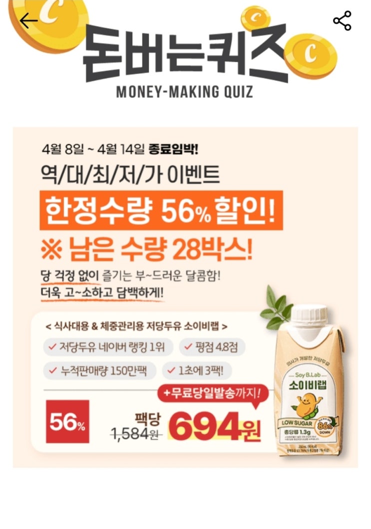 캐시워크 돈버는퀴즈 키토선생 소이비랩 달콤한 저당두유
