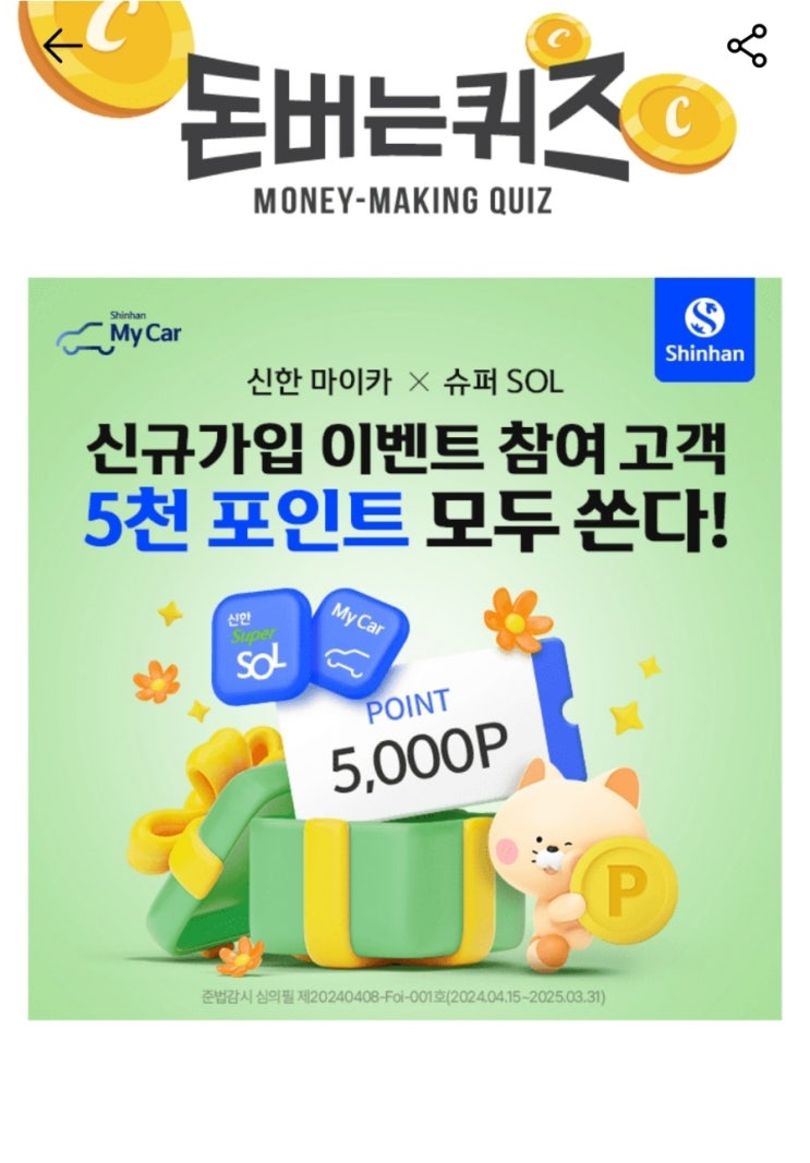 캐시워크 돈버는퀴즈 신한 마이카 MyCar 슈퍼SOL 앱 신규가입