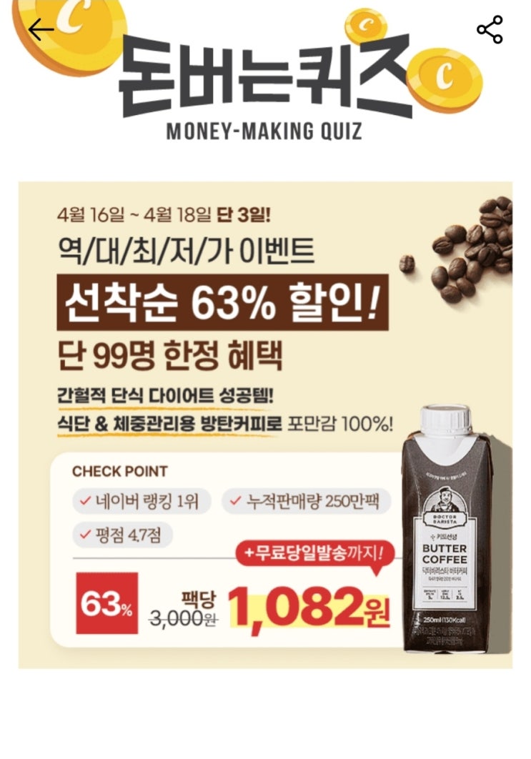 캐시워크 돈버는퀴즈 키토선생 닥터바리스타 방탄커피 버터커피