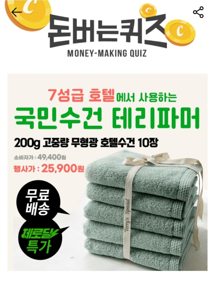 캐시워크 돈버는퀴즈 테리파머 호텔수건
