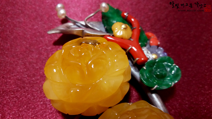 연원비 # 천연 호박 뒤꽂이(천연 밀화 호박 장미, 산호 비취 밀화 머리꽂이)