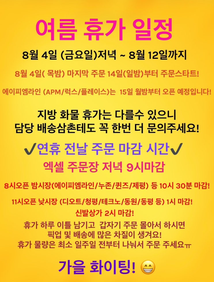 귀한 여름 휴가 일정이 돌아왔어요 :) 소매 도매 언니들 삼촌들 모두 고생하셨어요!! 우리 고객님들은 일정...