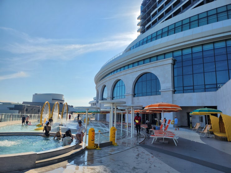 체크인후 바로 수영복갈아입고 객실가운입고 지하1층 수영장으로 갔어요~ 수영모자, 아쿠아슈즈 필수아니고...