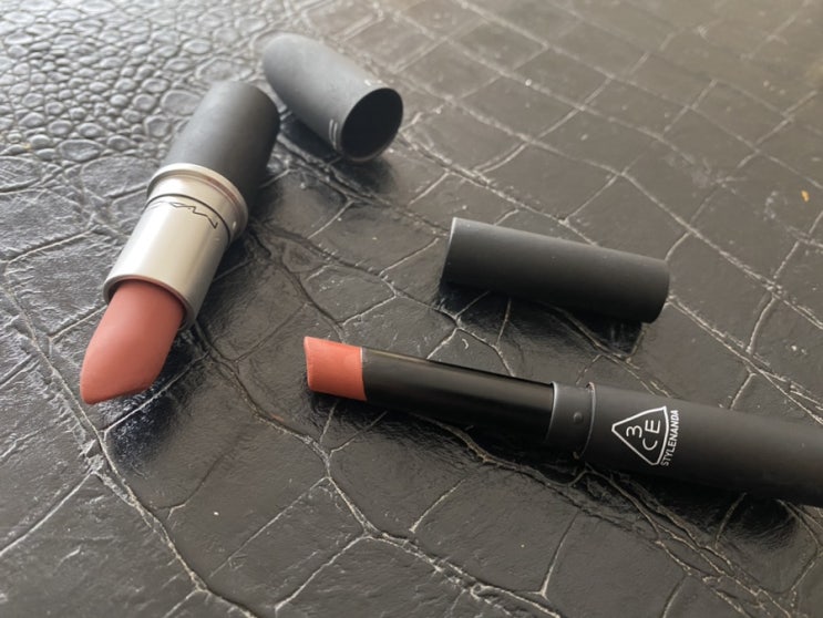 맥 MAC 파우더키스립스틱_멀잇오버/ 3CE 슬림벨벳립스틱_심플스테이(simple stay) 발색샷비교/ 말린장미립스틱/ 핑크베이지립스틱추천