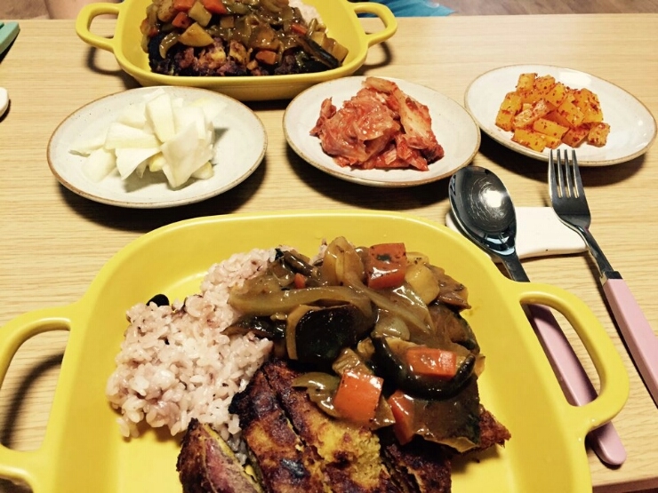 오늘밥상 -일본카레&돈까스 -피클 -김치 -단무지무침 초간단 저녁! ㅋㅋ돈까스가 많이 탔..... 아주 예...