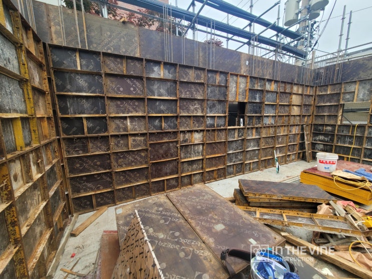 논현동 오피스 꼬마빌딩 건축 프로젝트 현장 (거푸집, 소방 및 오 배수관, 철근 배근, 시스템 비계, 전기함, 소방 배관, 보호벽)