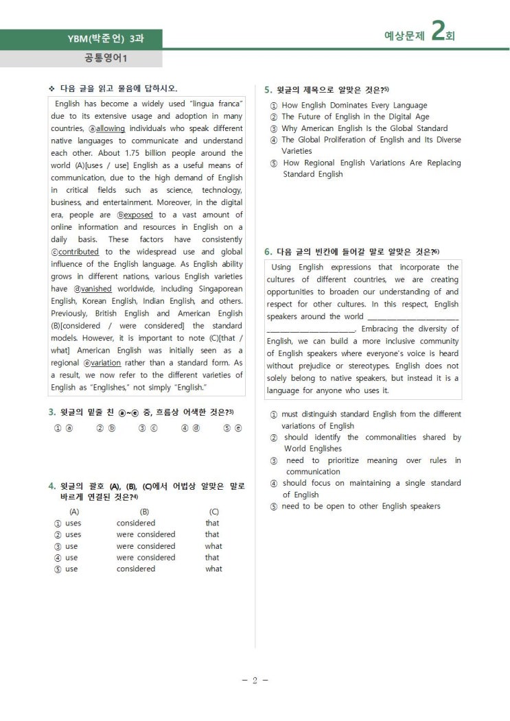 [도량 원호 문성 상위권이 다니는 영어학원 추천]공통영어1 YBM(박준언)_3과 변형문제 예상문제_4회중 2...